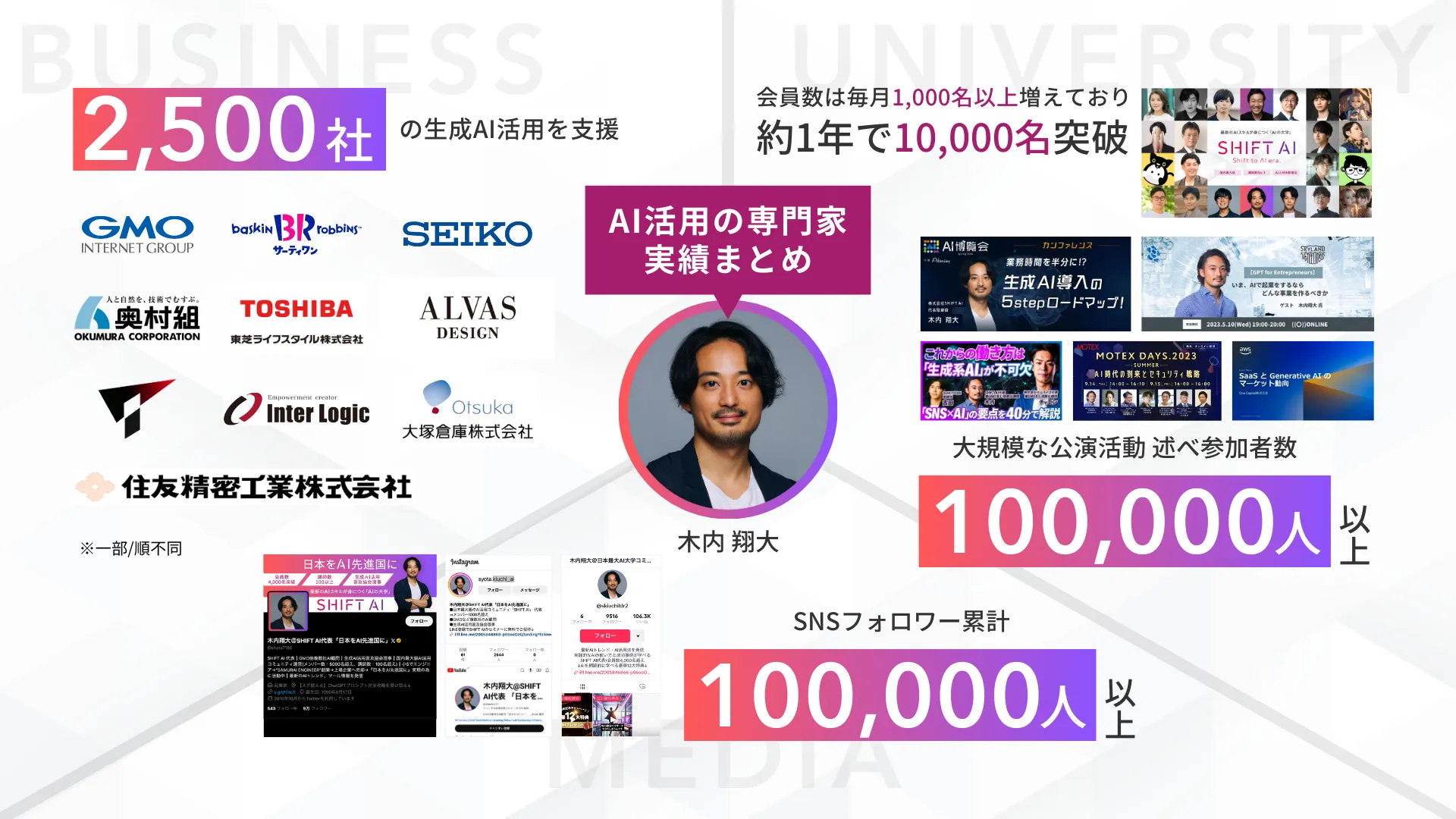 SHIFT AIコミュニティでは、最新のAIトレンドを網羅した豊富な学習教材と、AIの第一線で活躍する専門家による質の高い指導、そして目標を共有する仲間との交流を通じて、着実にAIスキルを習得し、あなたのキャリアやビジネスを加速させることができます
