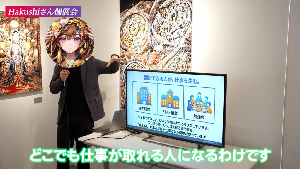 本イベントでは、Hakushi氏の圧倒的な世界観を表した個展と、AI活用における「教える力」の重要性を説くトークセッションが行われました。