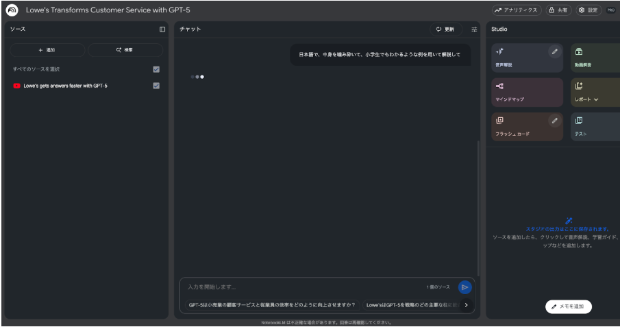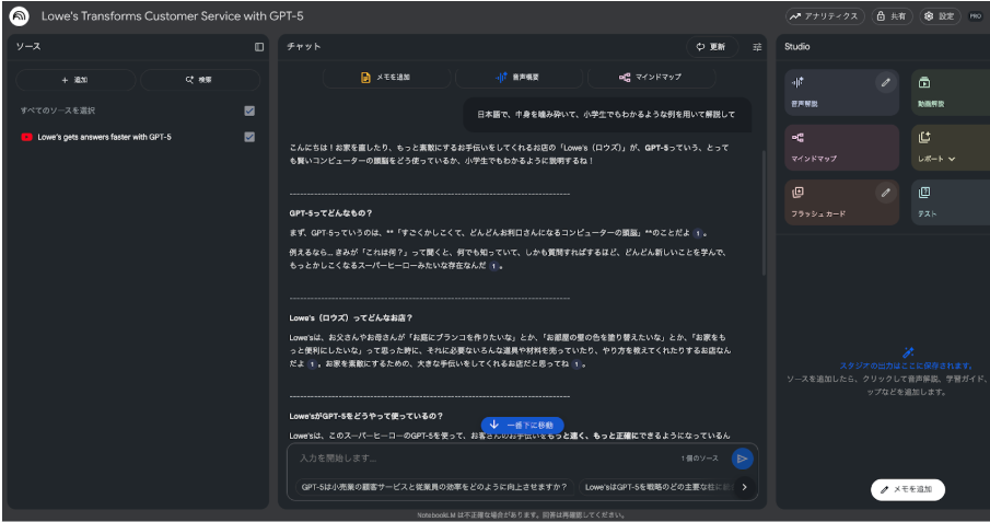 NotebookLMを活用すれば、ポッドキャストや論文、カンファレンス動画といった「時間も語学力も必要」な情報源を、効率的に吸収できます。言語の壁を下げて、情報を迅速に共有できることは大きなメリットでしょう。