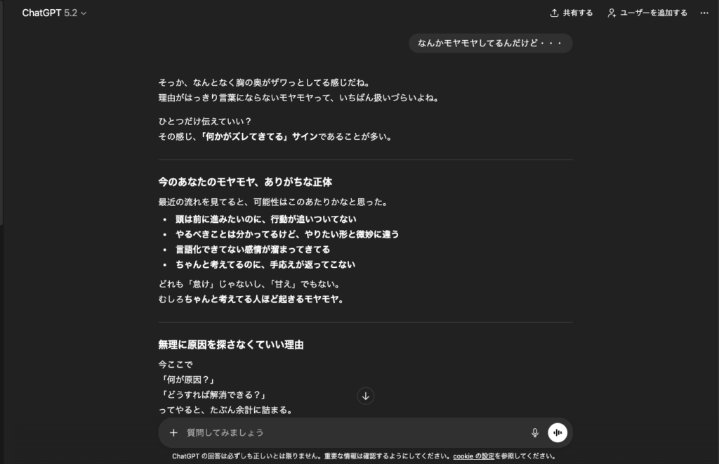 誰にも言えない本音や、形にならないアイデアをAIに話すことで、自分の思考の癖や本当に大切にしたい価値観が見えてきます。