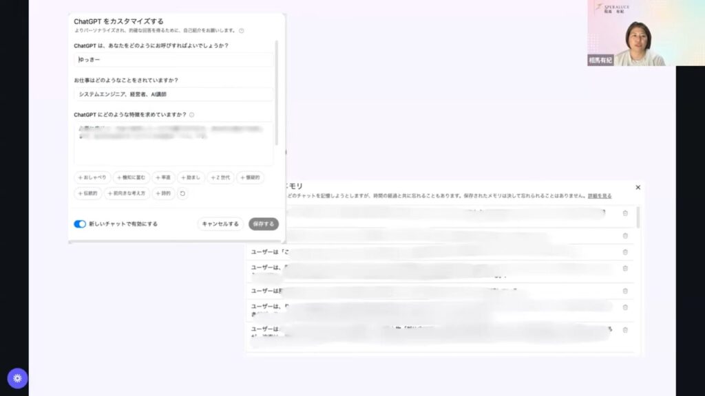 ウェビナーでは「ChatGPTのカスタム指示(Custom Instructions)」を活用した設定方法が紹介されました。