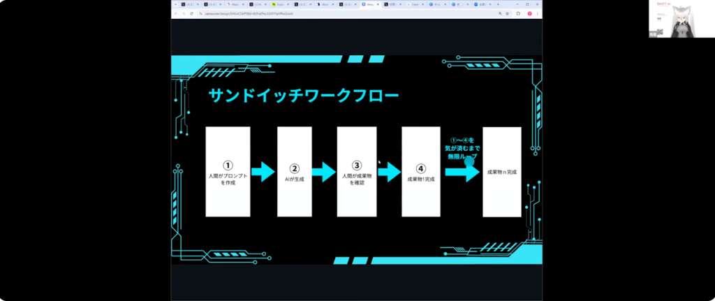 サンドイッチワークフローとは、人間とAIが交互に作業を行うことで、作品の質を高めていく制作プロセスのことです。