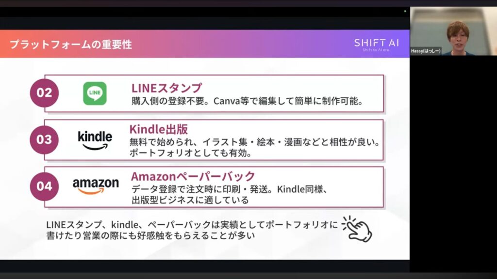 ※ウェビナー本編では、Kindle出版の具体的な登録手順や、より多くの人に手に取ってもらうための表紙デザインのコツなども詳細に解説しています。