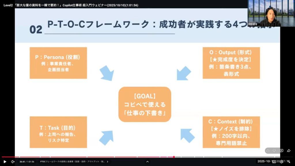 ウェビナーでは、誰でも精度の高い指示が出せるようになる「PTOCフレームワーク」が紹介されました。