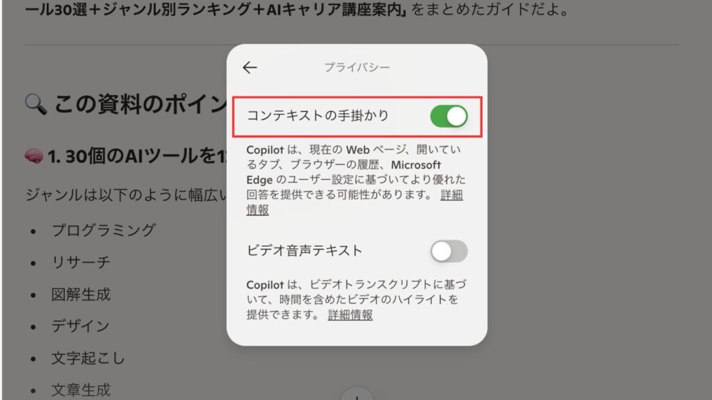 Copilotのサイドバー内にある「・・・」から「設定」→「プライバシー」の順にクリックし、「コンテキストの手掛かり*」という項目がオンになっているか確認しましょう。