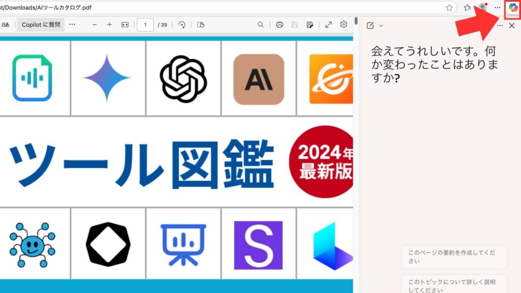 PDFを開いた状態で、ブラウザ右上の「Copilotアイコン」をクリックすると、画面右側にチャット形式のサイドバーが表示されます。