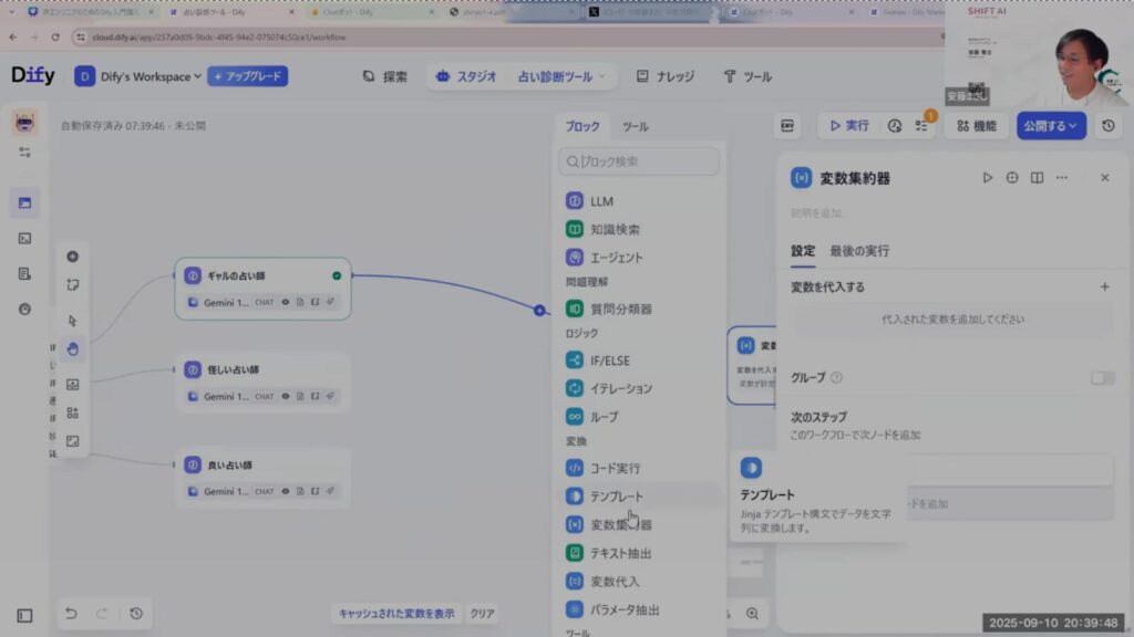 ウェビナーの実演では、LLMノード内のプロンプト(指示書)に「あなたはギャル風の占い師です」と記述することで、AIの口調やキャラクターを一瞬で変化させる様子が紹介されました。