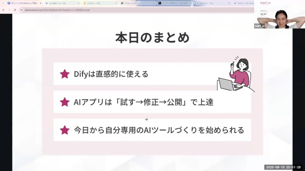 ここまで、Difyの基本的な仕組みから、変数や条件分岐を使ったアプリ開発のイメージまでをお伝えしました。