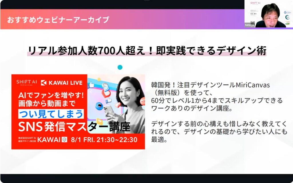 SHIFT AIの無料セミナーは、専門用語をできるだけ使わず、すぐに役立つ活用事例とわかりやすい解説を中心にお届けしています。