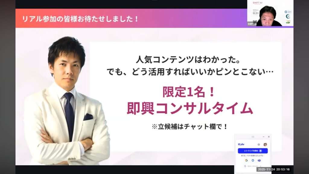 ウェビナーの後半では、参加者からの相談に答える「即興コンサル」が行われました。
