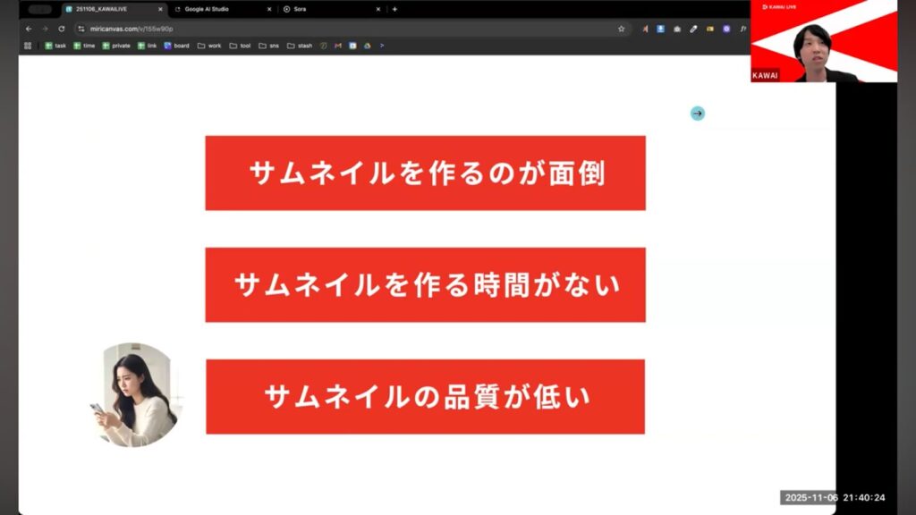 ウェビナーでは、まずサムネイルの重要性と、多くの人が抱える課題について解説されました。