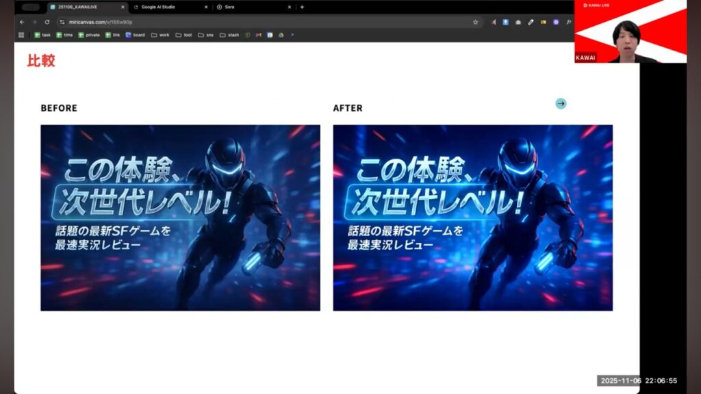 ※ウェビナーでは、これらの画像を生成するための具体的なプロンプトの記述内容や、使用するAIツール(ChatGPT、Gemini、Soraなど)の設定方法についても詳しく解説されました。