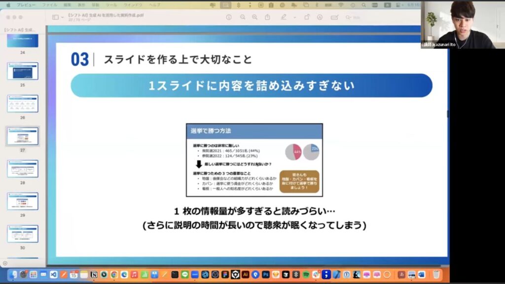 今回のウェビナーでは、スライド作成の基本ルールから、生成AIを使った資料作成の具体的な手順まで幅広く紹介されました。
