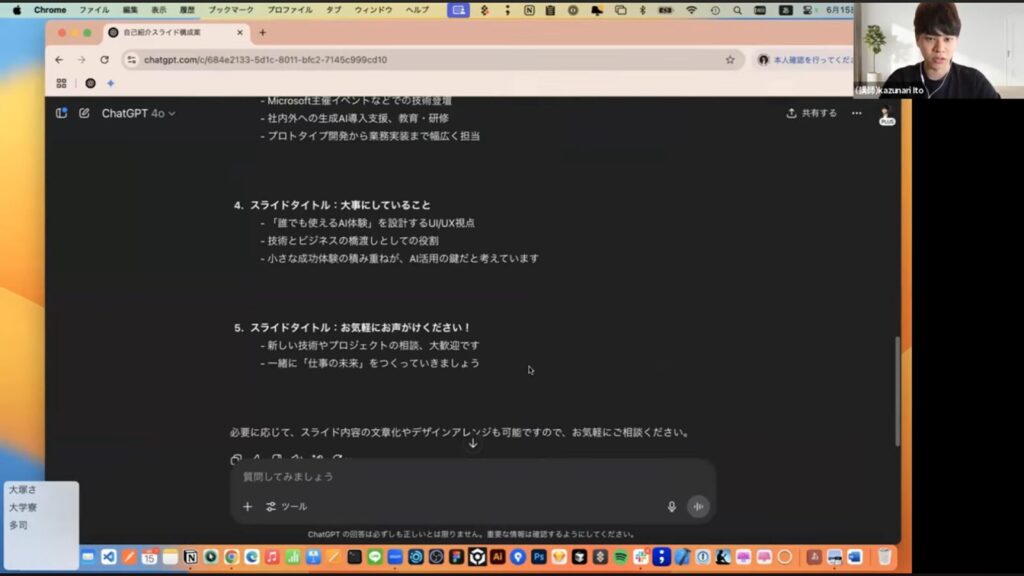 「以下の情報をもとに自己紹介スライド全3〜5枚の構成を考えてください」と指示するだけで、スライドの構成案が数分で出来上がります。
